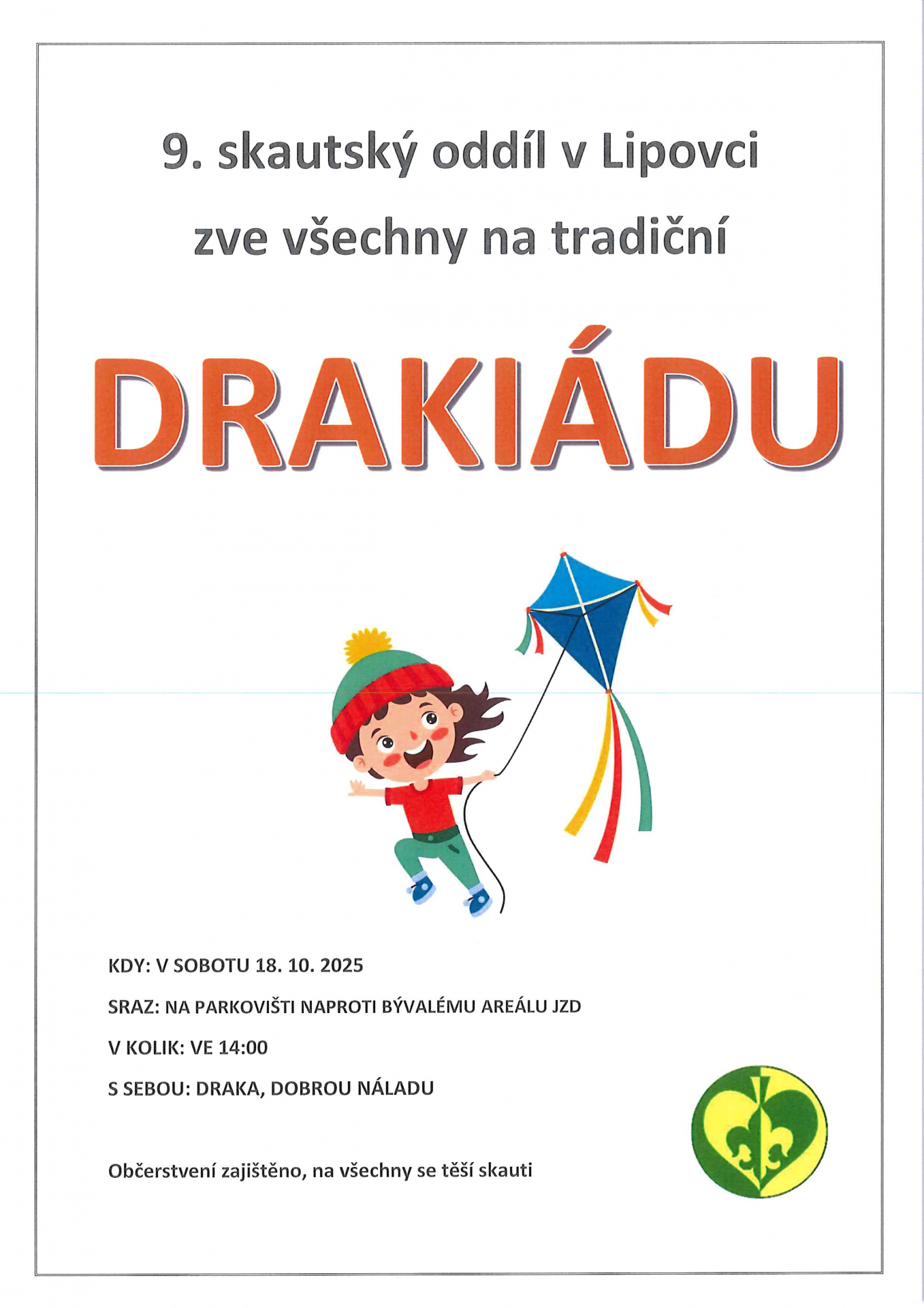 5. Skautský oddíl v Lipovci zve všechny na tradiční DRAKIÁDU, která se koná v sobotu 18.10.2025 se srazem na parkovišti naproti bývalému areálu JZD ve 14:00 hodin.